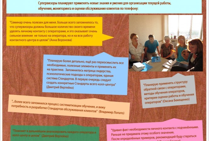 Проект по обучению супервизоров включал в себя анализ процесса обслуживания клиентов по телефону, согласованности алгоритмов взаимодействия супервизора с операторами и оператора с клиентами требованиям нормативных документов колл-центра (КЦ), обучение специалистов КЦ по программе «Супервизор колл-центра» (I ступень), подготовку и защиту индивидуальных проектов участниками.
