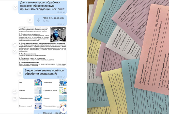 Для самоконтроля в процессе внедрения тренер предложила участникам специально разработанный чек-лист, с помощью которого каждый может проанализировать умение обрабатывать возражения согласно схеме, подбирать наиболее подходящий приём и определять, как обработка возражения отразилась на результатах разговора.